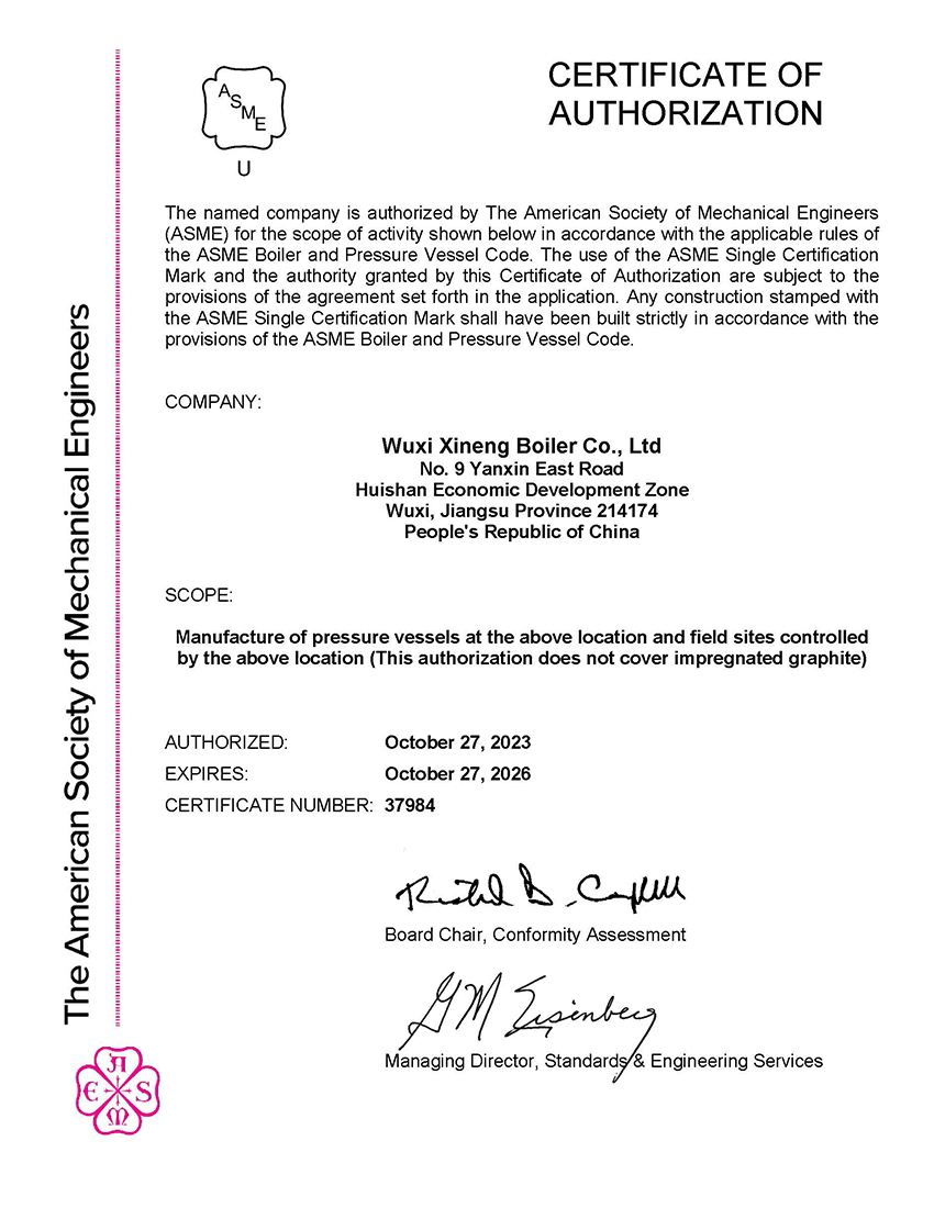 ASME certification is one of the most authoritative design and manufacturing qualifications for boilers and pressure vessels internationally, and is a passport for boiler and pressure vessel equipment manufacturing enterprises and products to enter the international market. The company needs to undergo joint inspection and certificate renewal every three years, and holding an ASME certificate also signifies that the company's management and technology have always been at the international leading level.