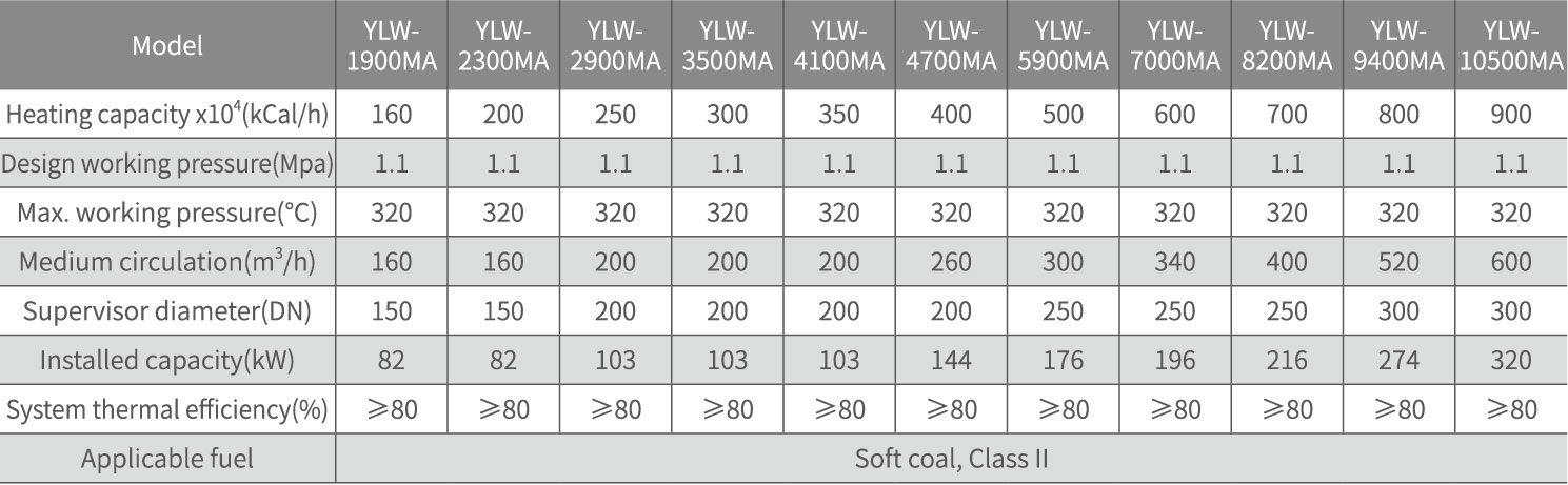 Heating power: 1.9MW - 35MW (160xl04Cal/hr - 3000xl04Cal/hr) Specific parameters are shown in Table8