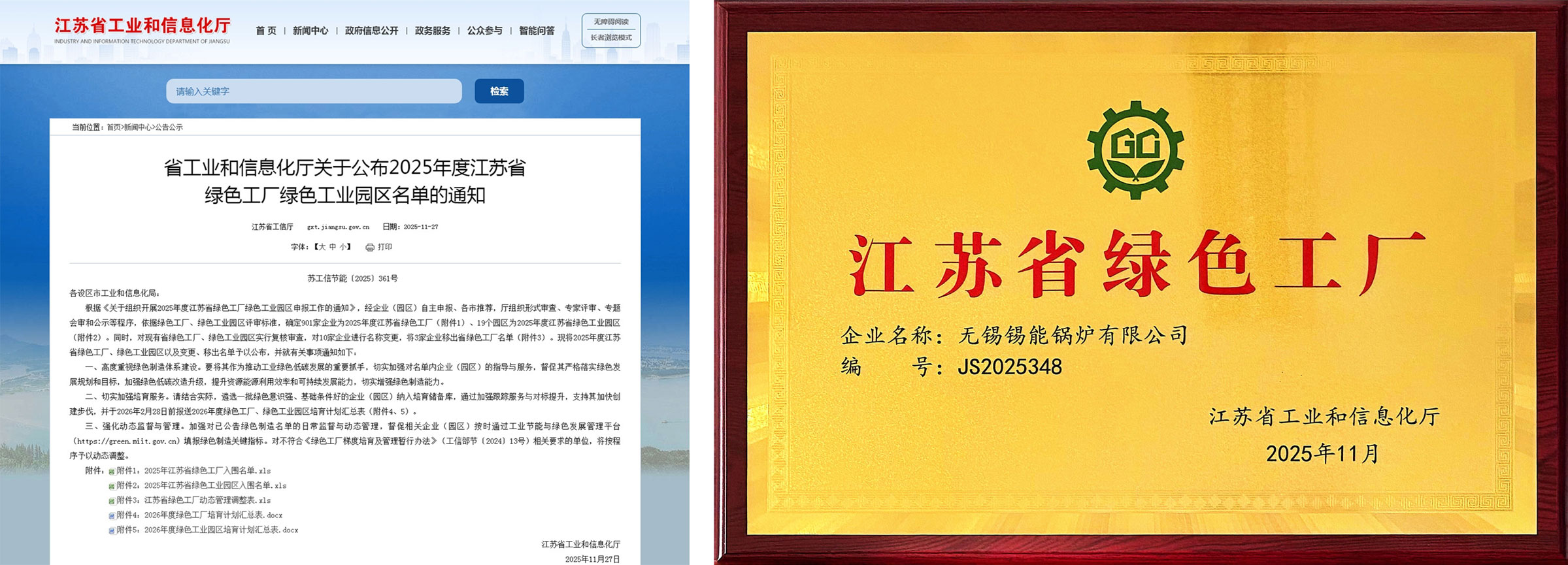 2025年11月27日,江苏省工业和信息化厅发布了《2025年度江苏省绿色工厂名单的通知》,无锡锡能锅炉有限公司成功入选,荣获“江苏省绿色工厂”称号。获此殊荣,意味着公司在能效水平、清洁能源利用、废弃物综合利用等指标方面,均达到或优于国家相关标准,是对公司在能源低碳化、节能减排等方面处于行业高水平的权威认可,也是对公司坚持走可持续绿色化发展道路的鼓励。